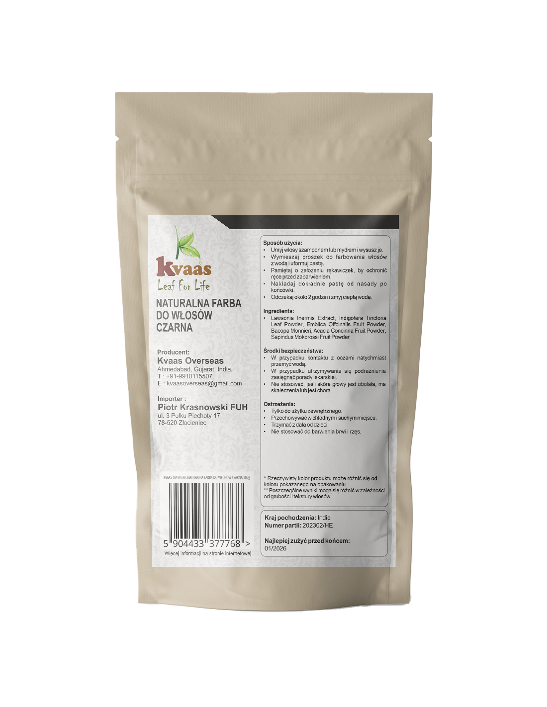 KVAAS NATURALNA ZIOŁOWA FARBA HENNA DO WŁOSÓW CZARNA 100g
