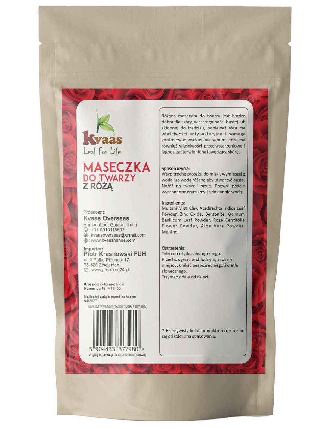 Wsyp trochę proszku do miski, wymieszaj z wodą lub wodą różaną aby utworzyć pastę. Nałóż na twarz i szyję. Pozwól paście wyschnąć po czym zmyj ją dokładnie wodą.