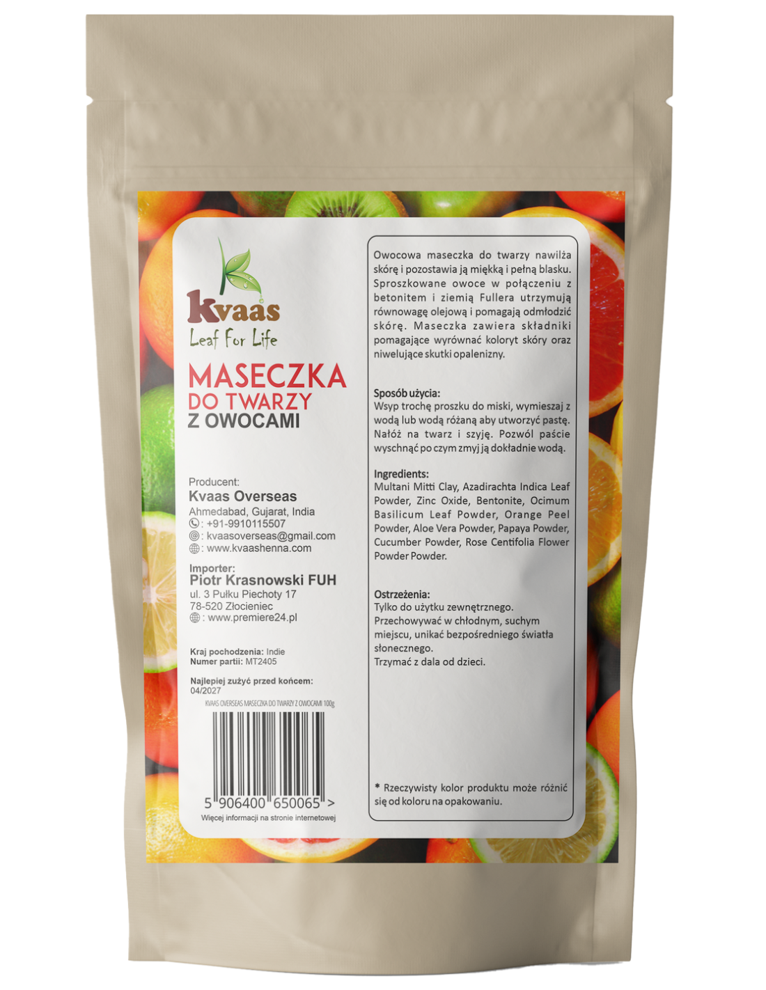 Owocowa maseczka do twarzy nawilża skórę i pozostawia ją miękką i pełną blasku. Sproszkowane owoce w połączeniu z betonitem i ziemią Fullera utrzymują równowagę olejową i pomagają odmłodzić skórę. Maseczka zawiera składniki pomagające wyrównać koloryt skóry oraz niwelujące skutki opalenizny.