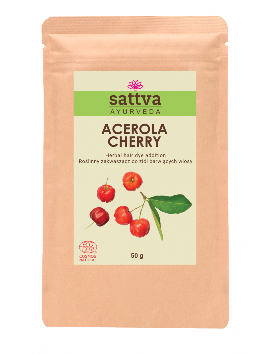 Witamina C jest niezbędną i silną witaminą o właściwościach przeciwutleniających, która chroni mieszki włosowe przed wolnymi rodnikami. Acerola działa również jako zakwaszacz do Sattva Henna Red. Dodanie go do ziołowej mieszanki barwiącej skutkuje jaśniejszymi i intensywnymi odcieniami czerwieni.