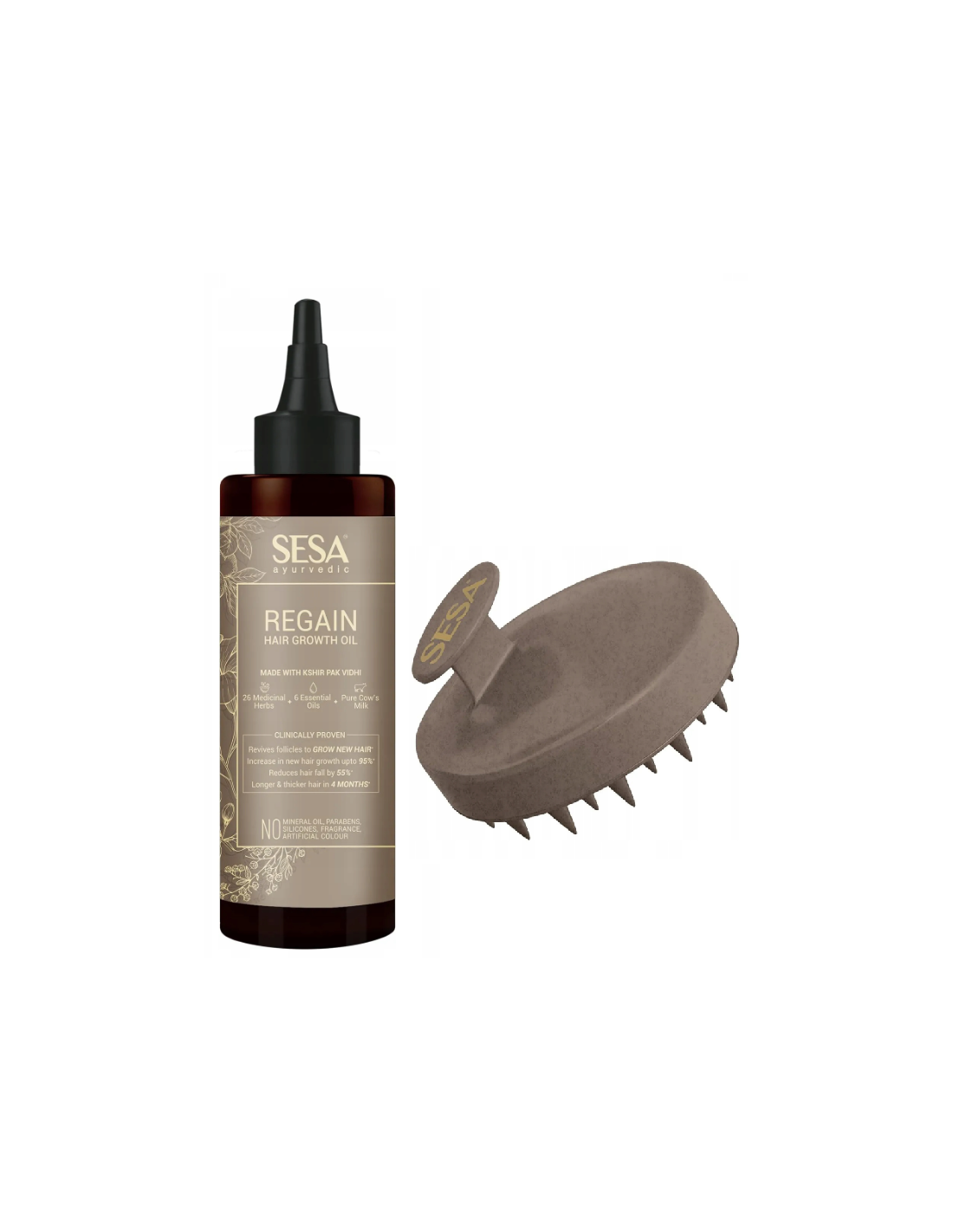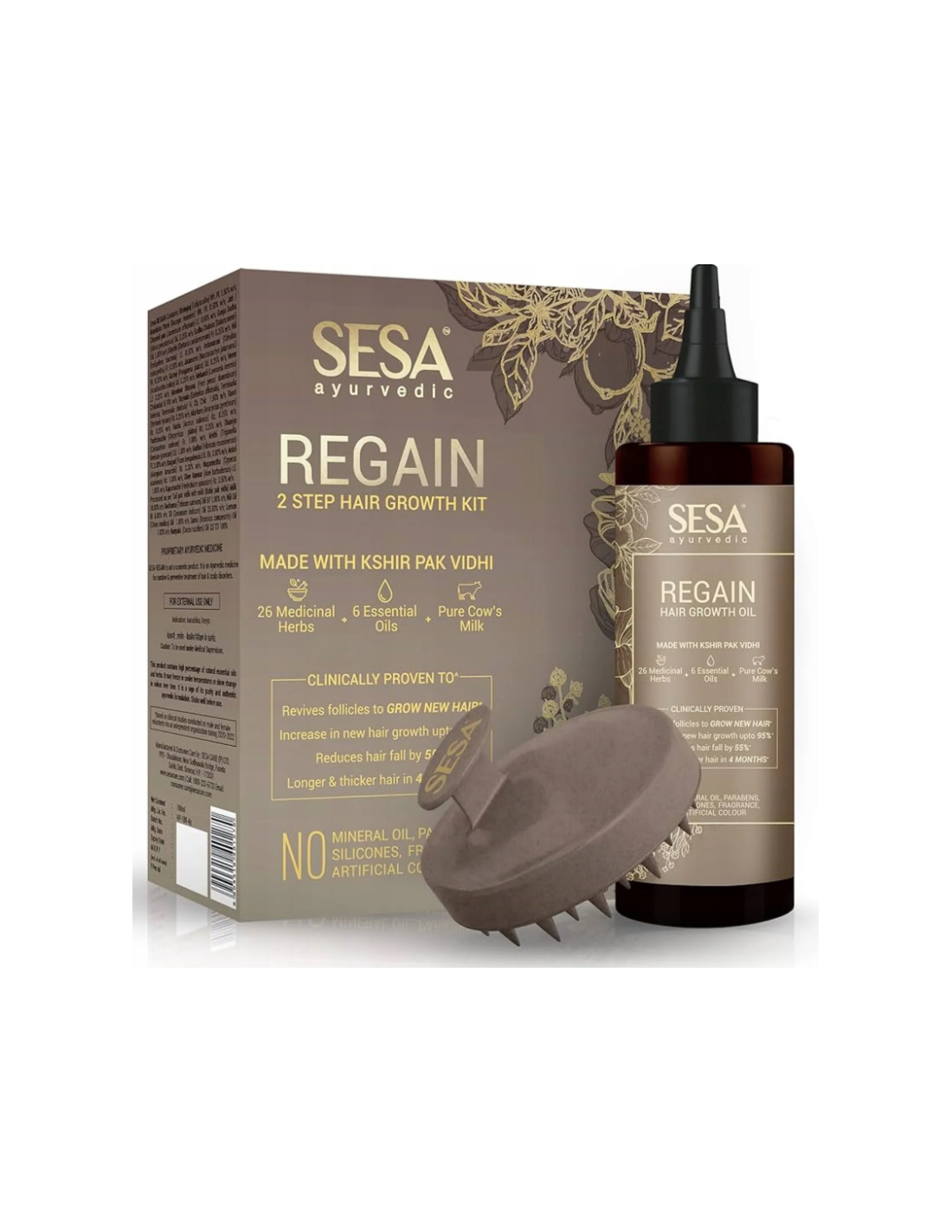 Zestaw do 2-etapowego porostu włosów Sesa Ayurvedic to innowacyjne rozwiązanie dla osób zmagających się z wypadaniem włosów i chcących pobudzić ich porost. Zestaw zawiera olejek Regain oraz masażer do skóry głowy, które wspólnie maksymalizują efekty pielęgnacyjne. Wyprodukowany tradycyjną metodą Kshir Pak Vidhi olej Regain zawiera 26 ziół leczniczych i 6 olejków eterycznych, które rewitalizują mieszki włosowe, ograniczają wypadanie włosów i wspomagają wzrost nowych, zdrowych włosów aż o 95%. Składniki aktywne takie jak Bhringraj, Shudha Dhatura, Triphala, olejek cytrynowy, olej migdałowy, olej kokosowy, olej z pestek winogron, olej różany, olej z orzechów włoskich i olejek lawendowy zapewniają kompleksową pielęgnację. Zestaw ten nie zawiera parabenów, olejów mineralnych i silikonów, oferując naturalne i bezpieczne wsparcie dla zdrowia włosów i skóry głowy.
