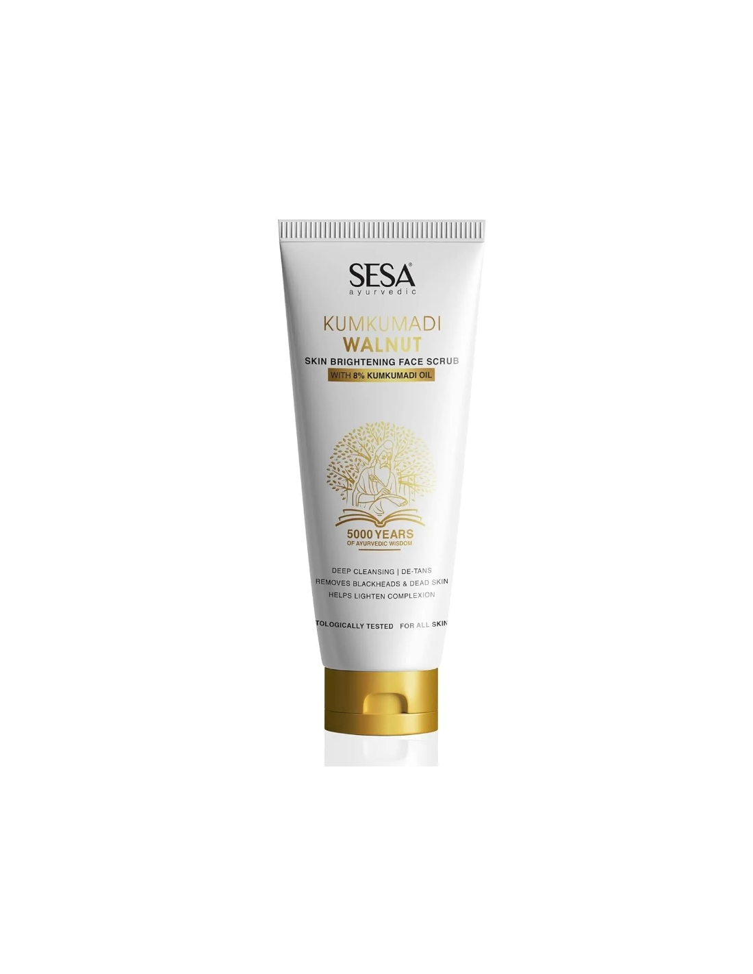 SESA 8% Kumkumadi Walnut Face Scrub to 100 g peeling do twarzy zapewniający głębokie oczyszczenie bez wysuszania, z bezpłatną wysyłką na cały świat. Wykonany z koziego mleka i drobno granulowanych orzechów włoskich, delikatnie złuszcza skórę, usuwając martwe komórki, nadmiar sebum i brud z zatkanych porów. Bogaty w kwasy Omega 3 i witaminę E, orzech głęboko oczyszcza, utrzymując jednocześnie nawilżenie. W skład peelingu wchodzą także zioła takie jak kesar/szafran, lotos, padmaka (wiśnia himalajska) i manjistha, znane w Ajurwedzie jako zioła Varnya ze względu na ich właściwości rozjaśniające skórę. Dzięki wysokiej zawartości drzewa sandałowego/chandamu, które chłodzi skórę, zwalcza uszkodzenia spowodowane słońcem i zanieczyszczeniami, wyrównuje koloryt skóry i przywraca jej blask. SESA Kumkumadi Walnut Skin Brightening Face Scrub z 8% PURE Kumkumadi Tailam (olejek) to ajurwedyjski peeling do twarzy, testowany dermatologicznie, odpowiedni dla WSZYSTKICH TYPÓW SKÓRY. Zastosowany olej Kumkumadi Tailam jest w 100% czysty i przygotowany według KSHIR PAK VIDHI – autentycznej receptury ajurwedyjskiej, w której ponad 17 wybranych ziół i olejków eterycznych gotuje się w czystym mleku kozim przez ponad 22 godziny.