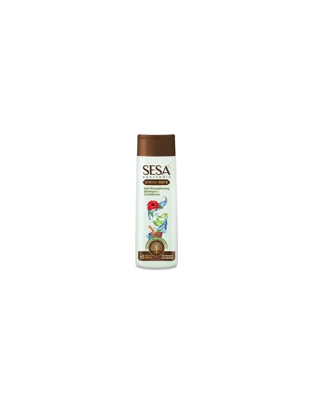 Szampon z odżywką do włosów Sesa wzmocniony jest ajurwedyjską mieszanką olejków i ziół, dzięki czemu włosy są odżywione i oczyszczone w delikatny dla nich sposób.