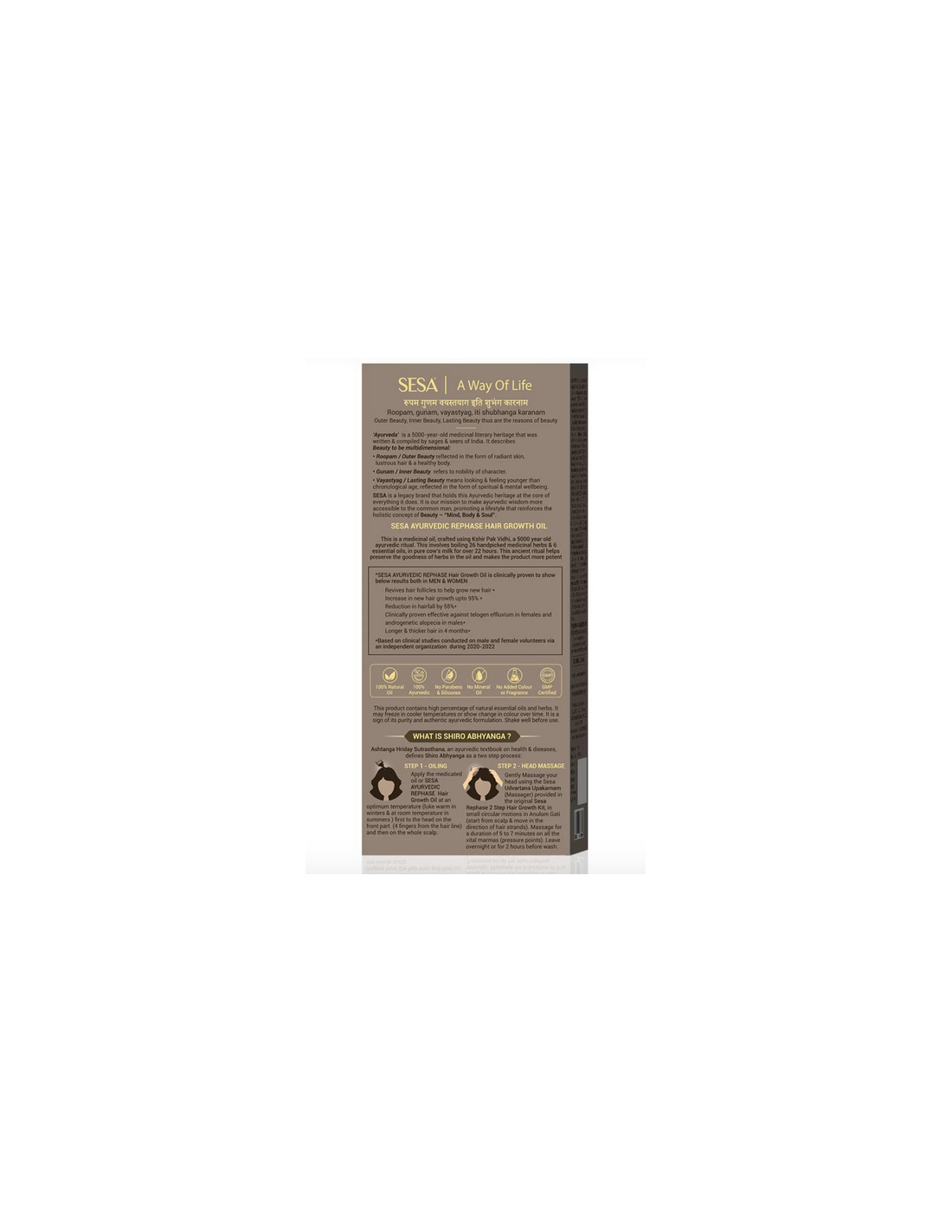 Ingredients: 100 ml Sesa Rephase Contains: Bhringraj (Eclipta alba) Wh. Pl. 1.50% w/v, Manduka Parni (Bacopa monnieri) Wh. Pl. 0.50% w/v, Jati / Chameli pan (Jasminum officinale) Lf. 0.50% w/v, Gunja Sudha (Abrus precatorius) Sd. 0.25% w/v, Sudha Dhatura (Datura metel) Sd. 1.00% w/v, Elaychi (Elettaria cardamomum) Fr. 0.25% w/v, Nili (Indigofera tinctoria) Lf. 0.50% w/v, Indravaruni (Citrullus colocynthis) Fr. 0.50% w/v, Jatamansi (Nardostachys jatamansi) Rt. 0.25% w/v, Karanj (Pongamia glabra) Sd. 0.25% w/v, Neem (Azadirachta indica) Sd. 0.25% w/v, Mehandi (Lawsonia inermis) Lf. 0.25% w/v, Mandoor Bhasma (Ferri peroxi dumrubrum) Chakardat 0.74% w/v, Triphala (Embelica officinalis, Terminalia belerica, Terminalia chebula) Fr. Ch. Chik 1.50% w/v, Rasot (Berberis lycium) Rt. 0.25% w/v, Akarkara (Anacyclus pyrethrum) Rt. 0.25% w/v, Vacha (Acorus calamus) Rz. 0.25% w/v, Yashtimadhu (Glycyrrhiza glabra) Rt. 0.25% w/v, Dhaniya (Coriandrum sativum) Fr. 1.00% w/v, Methi (Trigonella foenum-graecum) Sd. 1.50% w/v, Gudhal (Hibiscus rosasinensis) Fl. 3.00% w/v, Bargad (Ficus bengalensis) St. Bk. 3.00% w/v, Ankol (Alangium lamarckii) Rt. 2.00% w/v, Nagarmotha (Cyperus scariosus) Rz. 1.00% w/v, Ghee Kunwar (Aloe barbadensis) Lf. 1.00% w/v, Kapurkachri (Hedychium spicatum) Rz. 0.50% w/v. Processed as per Tail pak vidhi with milk (Kshir pak vidhi) Milk 10.00% v/v, Godhuma (Triticum sativum) Oil BP 1.00% v/v, Nili Oil IH 8.00% v/v, Til (Sesamum indicum) Oil 25.00% v/v, Lemon (Citrus medica) Oil 1.00% v/v, Sarso (Brassica campestris) Oil 1.00% v/v, Nariyala (Cocos nucifera) Oil QS TO 100%