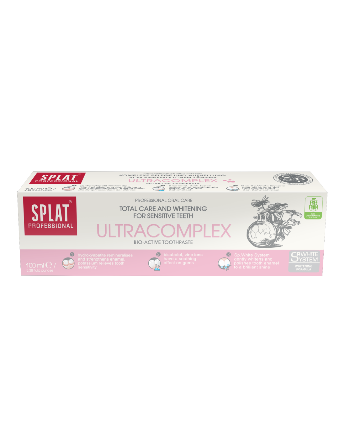 Pasta do zębów SPLAT ULTRACOMPLEX to pasta dla osób wymagających. Posiada unikalne składniki działające na nadwrażliwość oraz system delikatnego wybielania. Organicznego pochodzenia - Kalcis, pochodzący ze skorupek jaj, w połączeniu z hydroksyapatytem skutecznie wzmacniają zęby, zwiększają gęstość szkliwa i eliminują przyczyny wrażliwości. Jony potasu i cynku zmniejszają wrażliwość szkliwa, oraz działają ściągająco i przeciwzapalnie na dziąsła. Pasta z nowatorskim systemem Sp.White jest przeznaczona do bezpiecznego wybielania zębów. Nie zawiera fluoru.