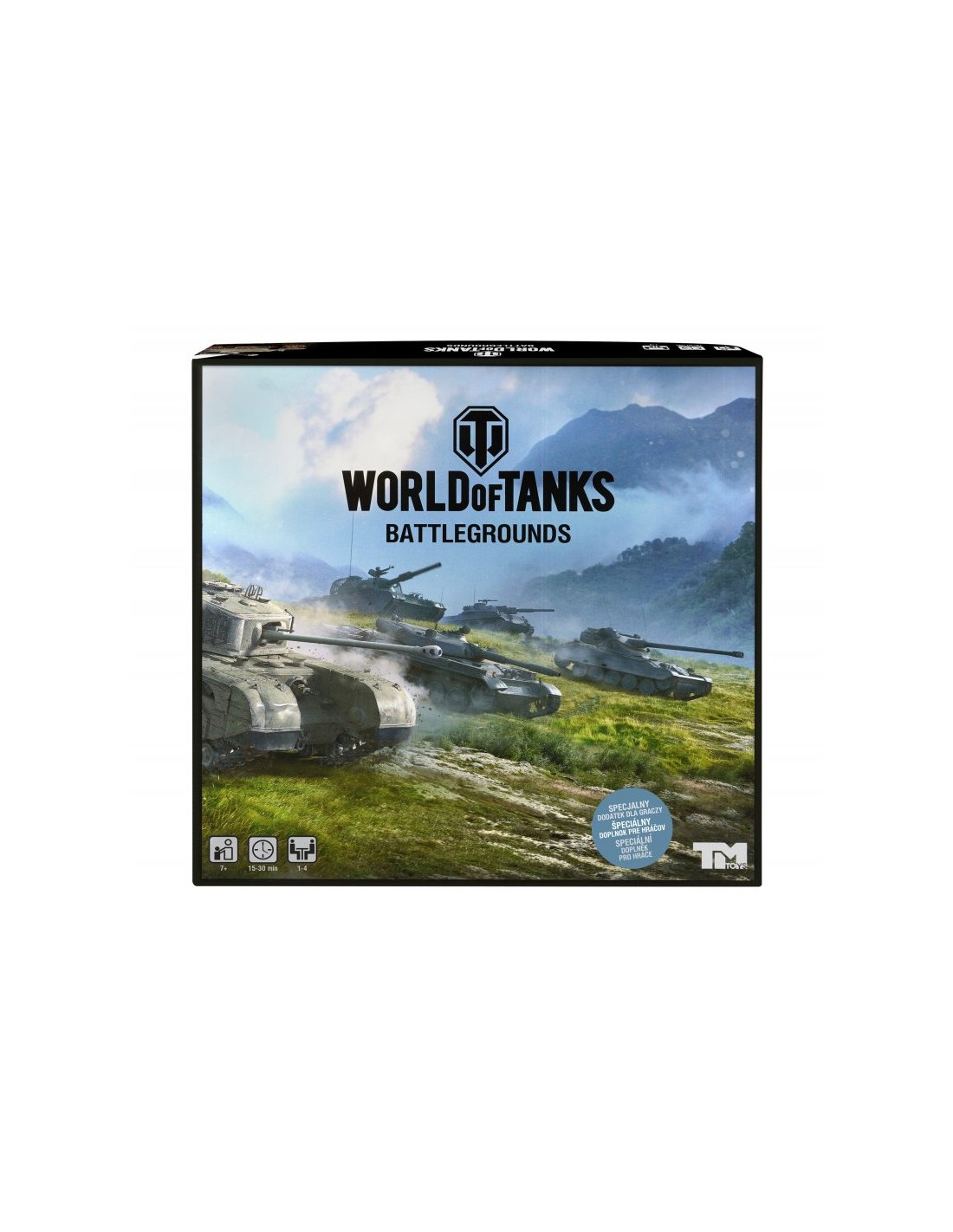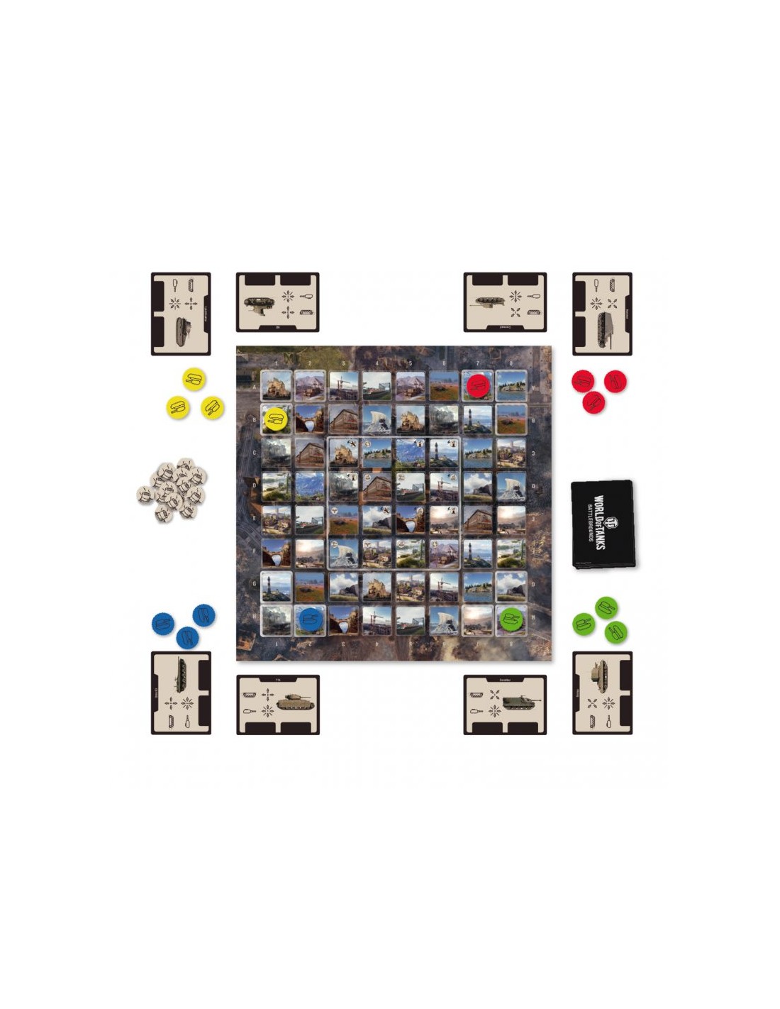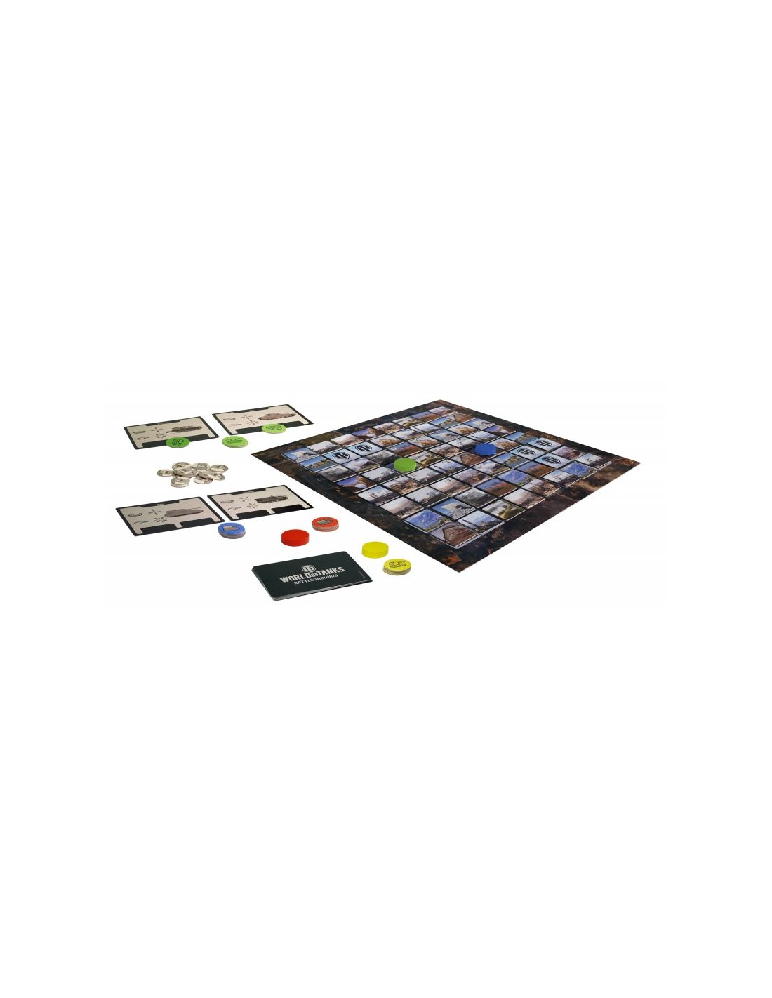 World of Tanks. Battlegrounds składa się z planszy, 12 kart z czołgami, 64 obrazkowych kart lokacji, 12 żetonów czołgów, 16 żetonów niewypałów oraz 4 drewnianych pionków. W rozgrywce może brać udział od 1 do 4 graczy, w której prowadzimy taktyczne starcia na zmieniającym się w każdej rozgrywce polu bitwy układanym z 64 żetonów lokacji! Znajdujemy pary, zbieramy usprawnienia do czołgów, uruchamiamy dodatkowe akcje, by ograniczyć przeciwnikom pole manewru lub zniszczyć ich czołgi by zdobyć przewagę w walce o punkty. Każda partia jest inna, a gra oferuje aż 4 warianty rozgrywki: Bitwa, Drużynowy, Familijny oraz Solo dla 1 gracza! Obrazki czołgów oraz lokacji są licencjonowane i pochodzą z oryginalnej gry World of Tanks. Wszystkie maszyny są prawdziwymi czołgami zaprojektowanymi bądź wykorzystywanymi podczas bitew w czasie II wojny światowej.