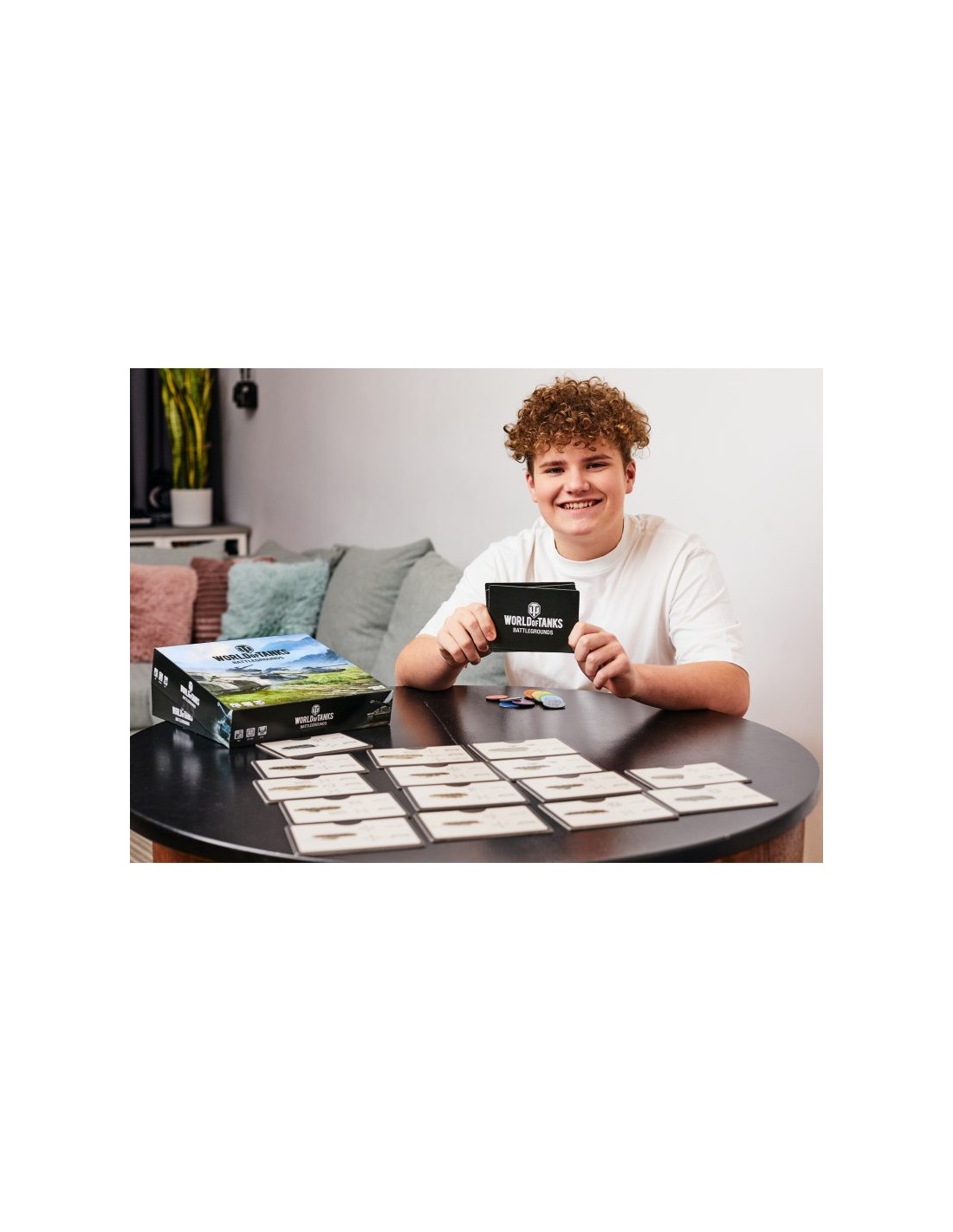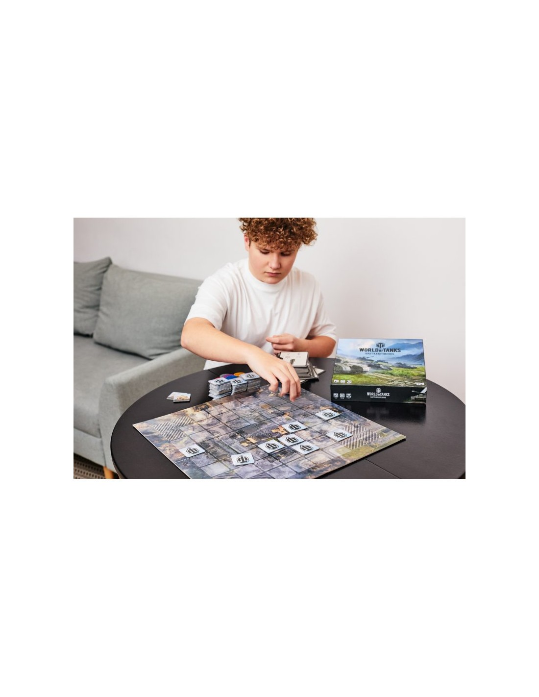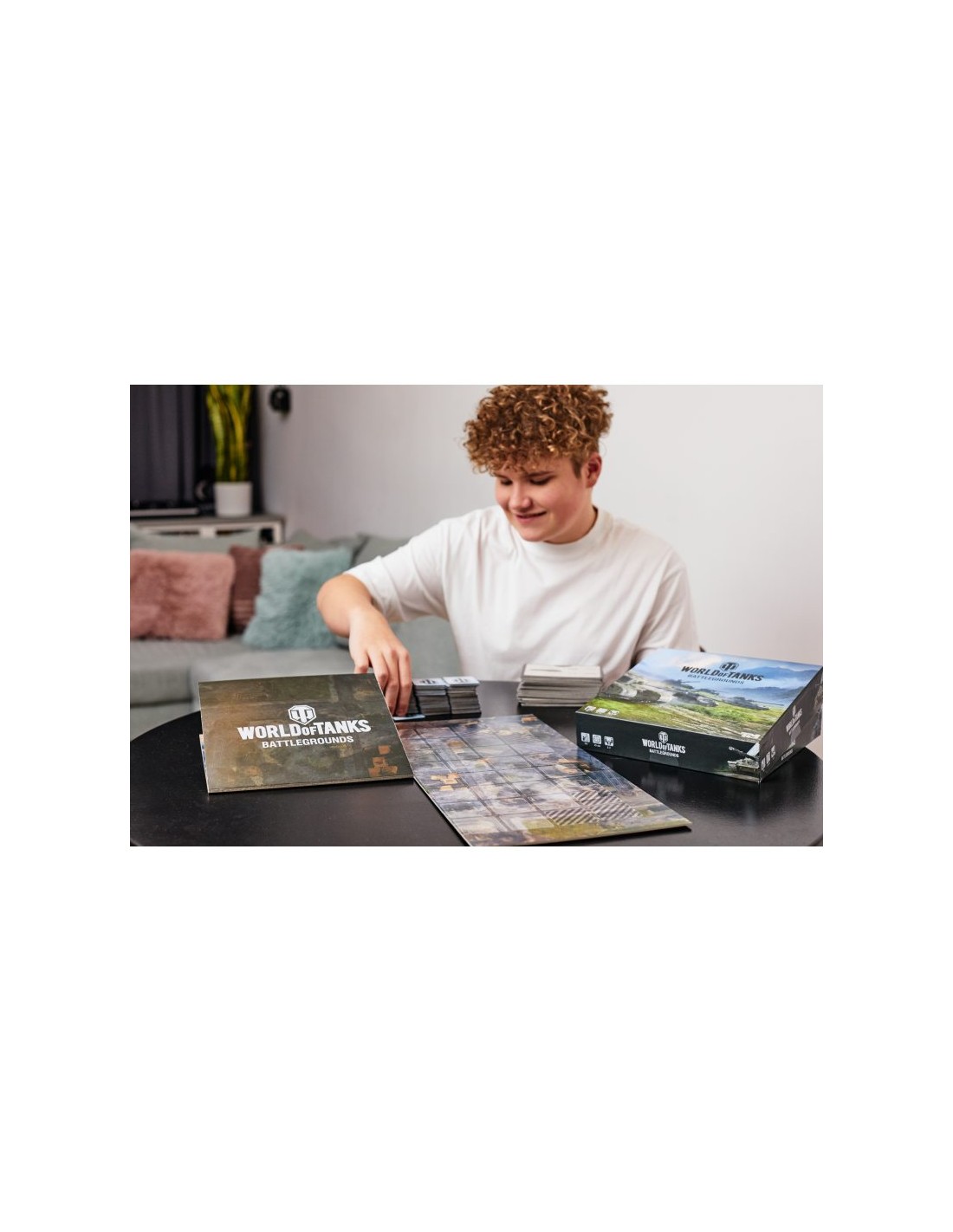 World of Tanks. Battlegrounds składa się z planszy, 12 kart z czołgami, 64 obrazkowych kart lokacji, 12 żetonów czołgów, 16 żetonów niewypałów oraz 4 drewnianych pionków. W rozgrywce może brać udział od 1 do 4 graczy, w której prowadzimy taktyczne starcia na zmieniającym się w każdej rozgrywce polu bitwy układanym z 64 żetonów lokacji! Znajdujemy pary, zbieramy usprawnienia do czołgów, uruchamiamy dodatkowe akcje, by ograniczyć przeciwnikom pole manewru lub zniszczyć ich czołgi by zdobyć przewagę w walce o punkty. Każda partia jest inna, a gra oferuje aż 4 warianty rozgrywki: Bitwa, Drużynowy, Familijny oraz Solo dla 1 gracza! Obrazki czołgów oraz lokacji są licencjonowane i pochodzą z oryginalnej gry World of Tanks. Wszystkie maszyny są prawdziwymi czołgami zaprojektowanymi bądź wykorzystywanymi podczas bitew w czasie II wojny światowej.