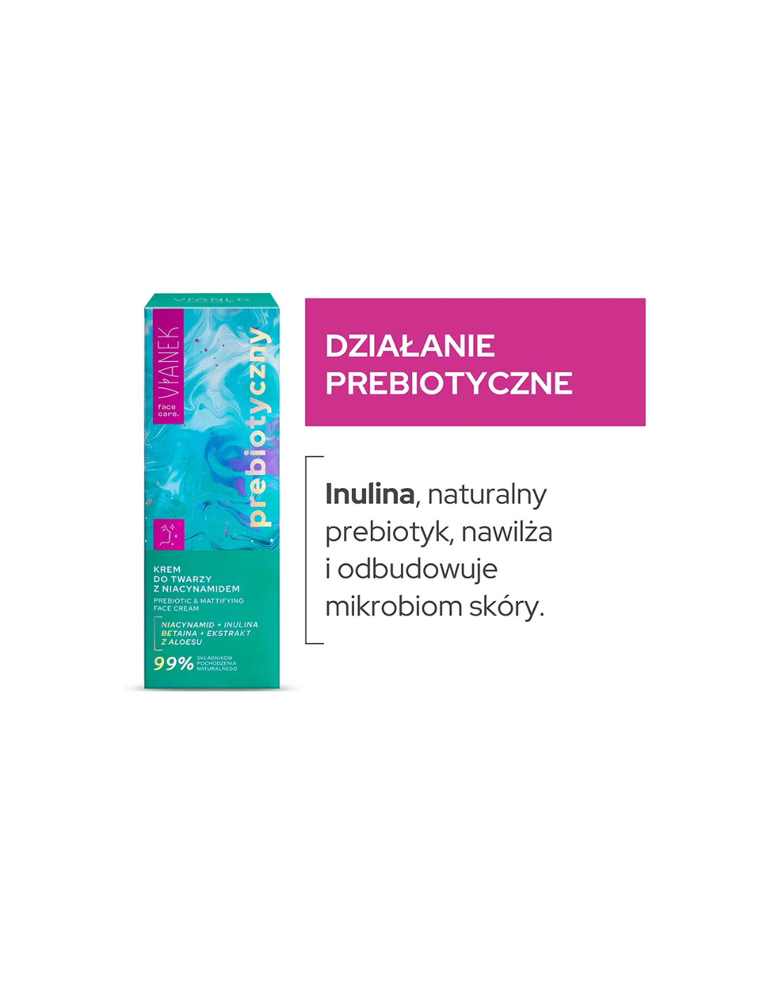 Krem zawiera inulinę, naturalny prebiotyk, który pomaga nawilżać skórę i odbudowywać jej mikrobiom. Działanie prebiotyczne jest kluczowe w utrzymaniu zdrowej bariery skóry, chroniącej przed podrażnieniami i szkodliwymi czynnikami zewnętrznymi. Regularne stosowanie kemu pomaga poprawić kondycję skóry, sprawiając, że staje się gładka i promienna.